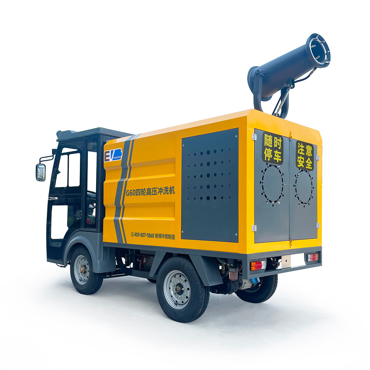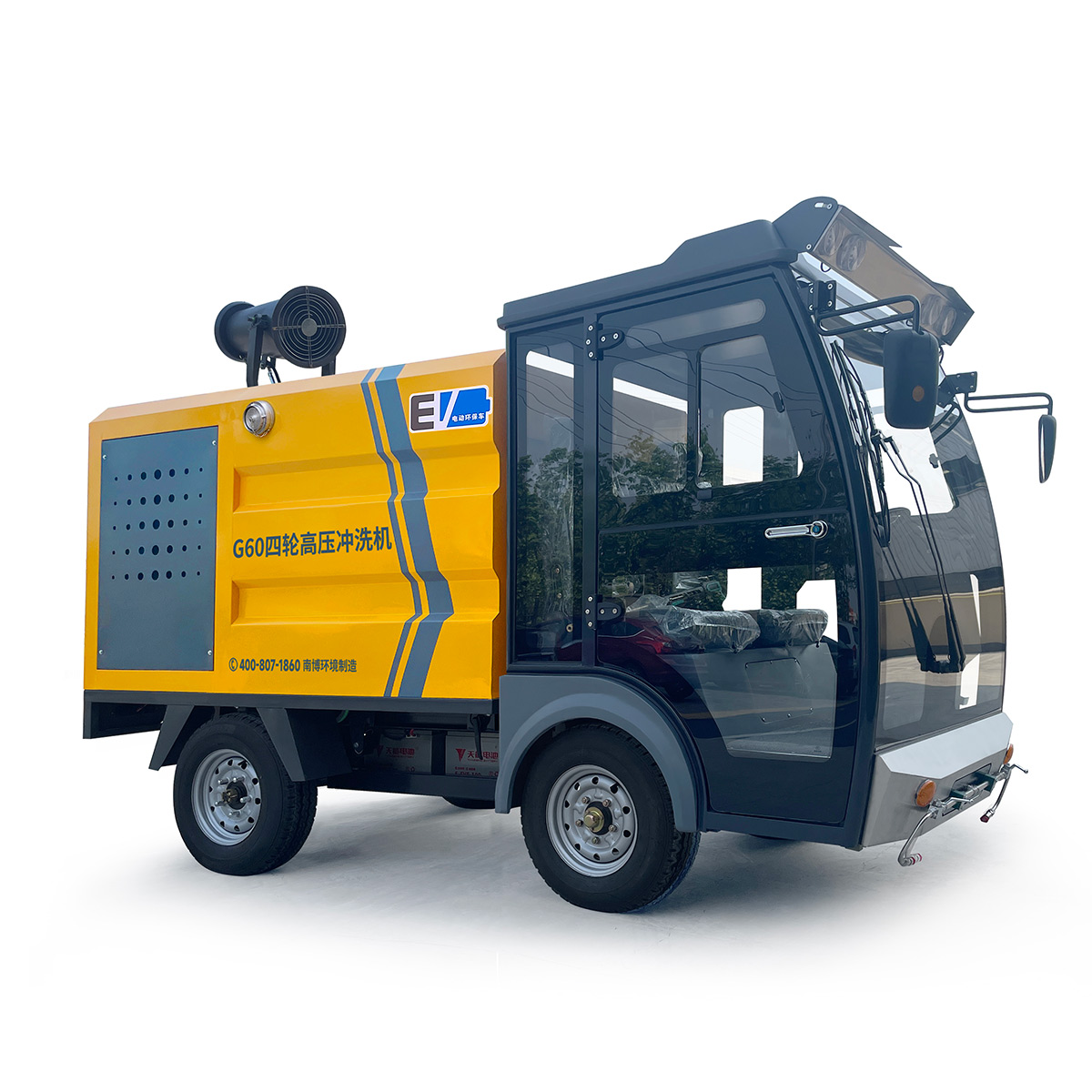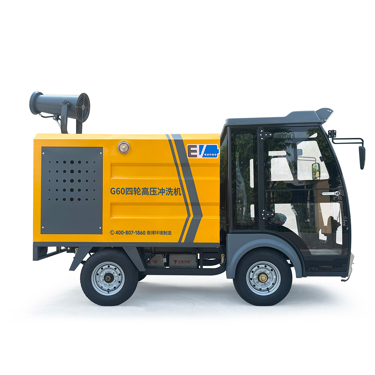 南博 G60 四輪高壓沖洗機,是一款純電動地面高壓沖洗養護裝備,外形美觀大方,具有多功能沖洗模式,配備側沖、前排沖、對沖、沖洗槍、后抑塵,可對各種人行道、輔道、路沿石及背街巷道,有效沖洗,作業效率高。車輛采用冷鉚拼接四輪車底盤結構牢固扎實,適合各種復雜路面。
